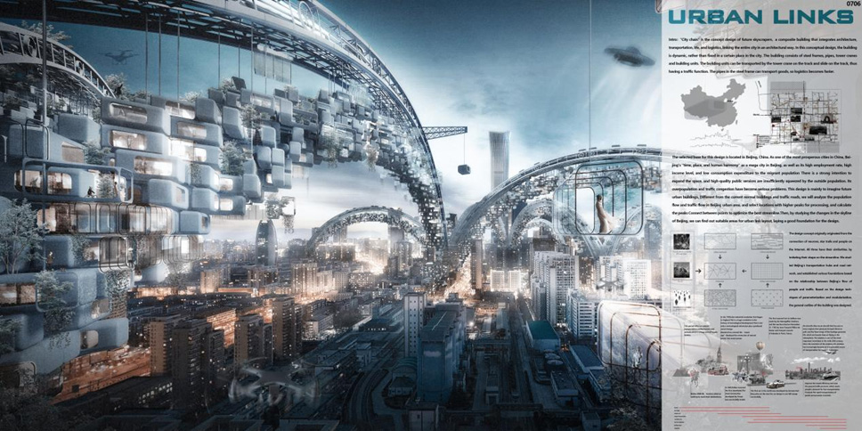 本届竞赛评委会从收到的492个项目中选出一、二、三等奖(各1个)和20个荣誉提名奖。值得一提的是,中国共有10组作品上榜,我校学子的作品是其中之一。杨馨茹等受美国太空探索技术项目“星光轨迹”的启发,在城市肌底上模仿“星链”的链接方式。在这个概念设计中,建筑是动态的,而不是固定在城市的某个地方。该作品中的建筑由钢架、管道、塔吊和建筑单元组成。建筑单元可通过塔吊在轨道上运输,并在轨道上滑动,具有交通功能。钢架内的管道可以运输货物,使物流变得更快。