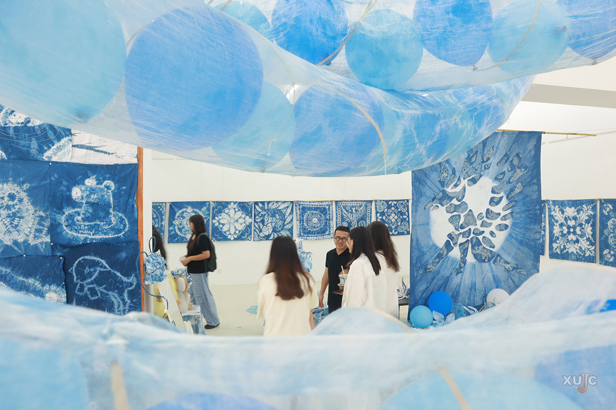 本次展览在嘉庚美术馆举行,共展出百余件作品,其中装置作品达13件。这些作品用扎染的“语言”重新诠释神话和海洋保护。鱼骨、珊瑚、水母等海洋生物,都成了同学们灵感的源泉。以“海洋保护”为主题的作品《溺骨》巧妙借海洋生物白骨为意象,将鱼骨造型与扎染艺术紧密结合,深刻揭示海洋生态危机的严峻现实,有力控诉过度捕捞与污染带来的恶果,引发人们对海洋保护的深刻反思。源自《山海经》的神异生物,也在同学们的巧手下,通过扎染绽放独特魅力。何罗鱼摇曳着十尾身躯在素绢上遨游,嘲风神兽以螺旋纹样盘踞于靛蓝布帛,羬羊的犄角化作层层叠染的花朵……每一件作品都仿佛在诉说着古老的神话故事。指导老师袁华斌说:“本次展览不仅是一次校园艺术文化建设的实践,也是绿色环保理念的全新解读,更是传统非遗文化的现代展示。”
