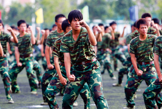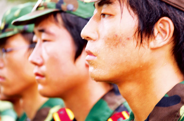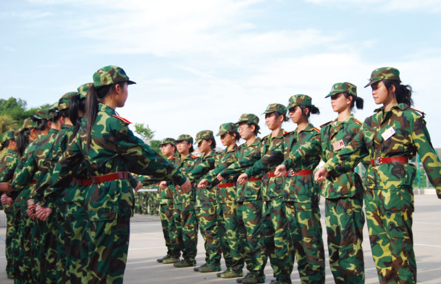 站军姿,抬头,挺胸,一天下来,浑身酸痛。踢正步,腿绷直,脚尖离地约25厘米,向前摆臂,约与第三个衣扣同高,一定30分钟,腿酸,手也酸。