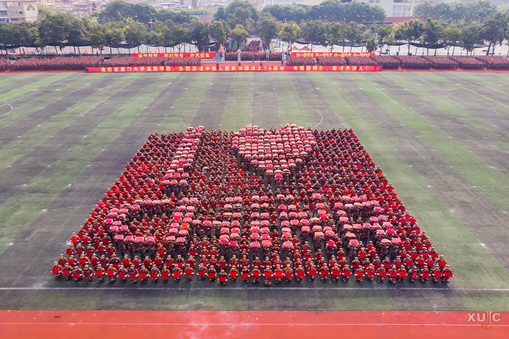 与此同时,站立在田径场后方的分列式方阵拉起一条横幅:“我们在厦门大学嘉庚学院,热烈庆祝中华人民共和国成立70周年!与祖国同行,做时代新人。”