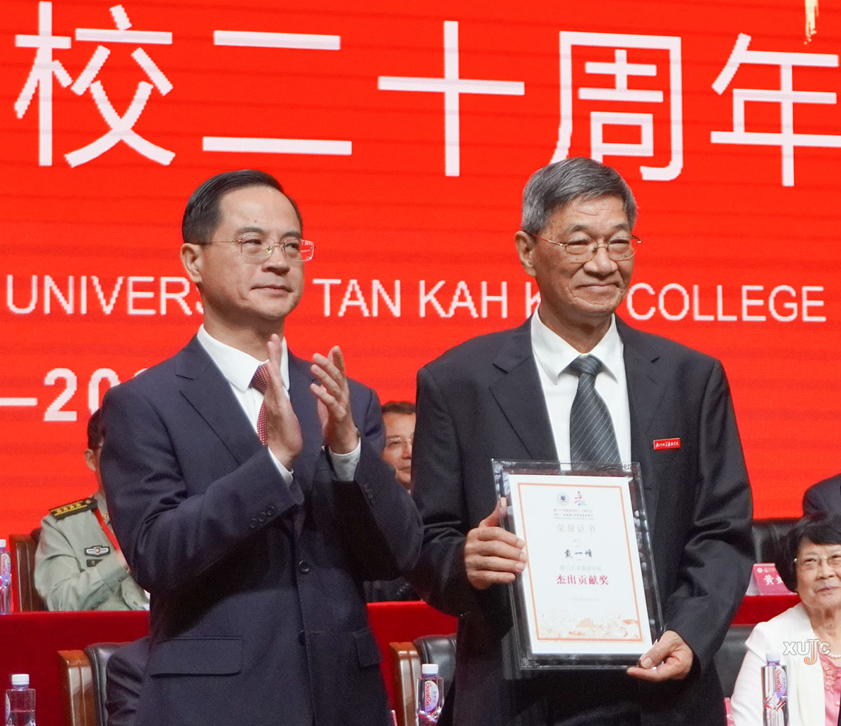 嘉庚学院党委书记邱伟杰(左)为杰出贡献奖获得者戴一峰(右)颁奖