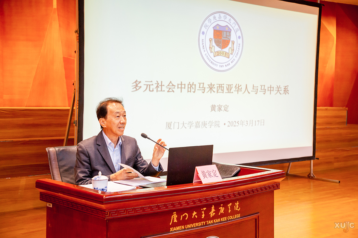马来西亚丹斯里黄家定是厦门大学南洋研究院/国际关系学院讲座教授、客座教授,曾任马来西亚首相对华特使、马来西亚-中国商务理事会主席、马来西亚国会议员、马来西亚房屋及地方政府部长、马来西亚华人公会总会长等重要职务。在主持讲座时,王瑞芳院长着重介绍了主讲人的成就。他强调,黄家定教授在促进马中友好关系以及推动马来西亚华人社会发展方面做出了突出的贡献,特别是在协助促成厦门大学在马来西亚建立分校方面不遗余力。他代表学校和全体师生对黄家定教授的莅临,表示诚挚的欢迎和衷心的感谢。
