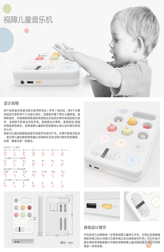 凌志豪和同学在一次课程作业调研中发现,市场上针对视障儿童的玩具几乎空白。这就是概念作品《视障儿童音乐机》的设计之源。凌志豪说,“评委可能是被以下两点打动的:1.对视障儿童的关注;2.对后续投产的技术结构问题做了比较充分的考虑。”