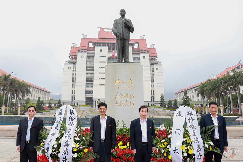 ■李伟中(右二)、林辉(右一)代表厦门大学,戴一峰(左二)、雷锐生(左一)代表嘉庚学院向陈嘉庚先生铜像敬献花篮。