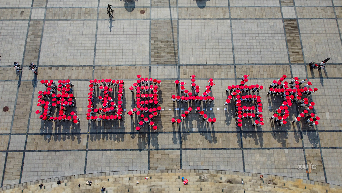 在活动正式开始前,来自各院系的270个同学手持红色卡纸,共同摆出“强国复兴有我”的方阵造型。五位学生代表带来振奋人心的诗朗诵《请党放心,强国有我》。