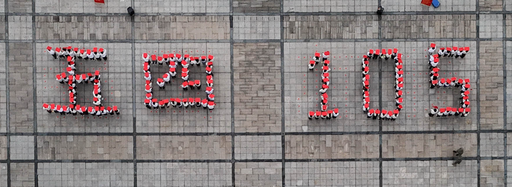 各单位团干和青年代表们用红板摆出“五四105”和“强国有我”两组图形,表达了对五四运动的纪念,也展示了新时代青年为祖国发展贡献力量的决心。