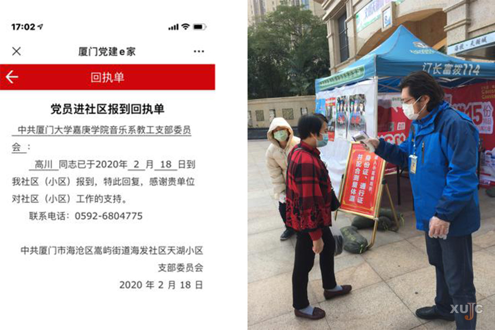 身在湖北的艺术设计系党员教师王占北积极支持荆楚“嘉园”师生联合党支部工作,精心录制剪辑了11个、时长合计60余分钟的书法小视频教授书法,鼓励同学们以“艺”战疫。音乐系党总支书记、音乐系教工党支部书记高川主动参加社区疫情防控的志愿者服务工作。很多教工党员积极响应“双报到”号召,身体力行担起社区疫情防控“守门员”“宣传员”“服务员”的职责。