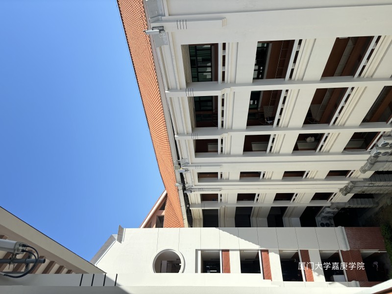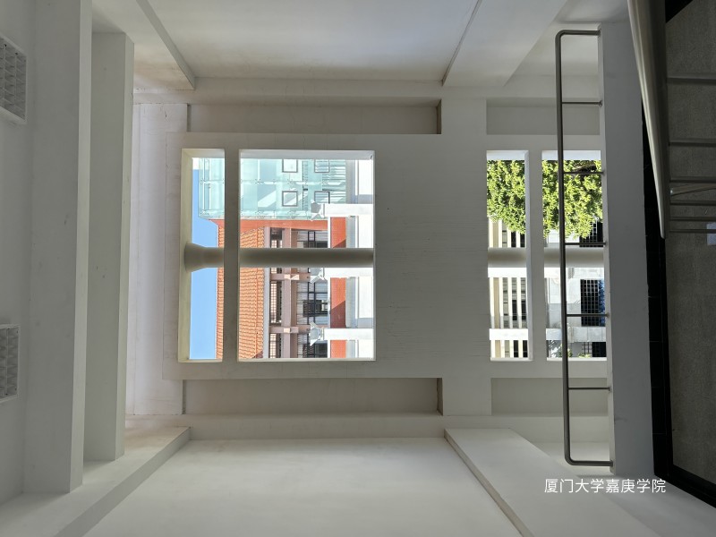 拾级而上,洁白的建筑框起一方天地,窗外红瓦绿树与蓝天相映,似是将厦门大学嘉庚学院的静好时光悄然收藏。