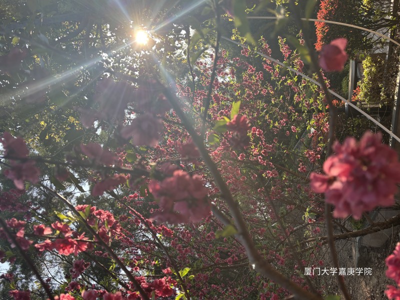 嘉庚学院的春日里,阳光似金缕穿花而过。粉嫩花朵缀满枝头,或绽或含苞,在光影中尽显娇俏。微风轻拂,花枝摇曳,晕染着春日的蓬勃与烂漫,绘就独属于嘉园的绚丽景致。