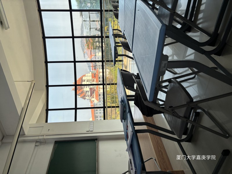 教室空寂,桌椅缄默。巨窗如框,框住嘉庚学院红顶建筑,与远山共成风景。阳光倾落,于桌面铺陈细碎光影,满室皆藏温柔与诗意,轻吟青春的诗章。