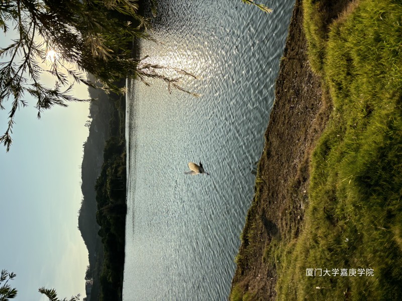 日暮时分,嘉园湖面波光粼粼。飞鸟振翅于澄澈湖面之上,身姿轻盈灵动。远处山峦、葱郁树木与湖光相融,夕阳的余晖洒下,给这方天地披上一层金纱。时光仿佛在此刻静止。