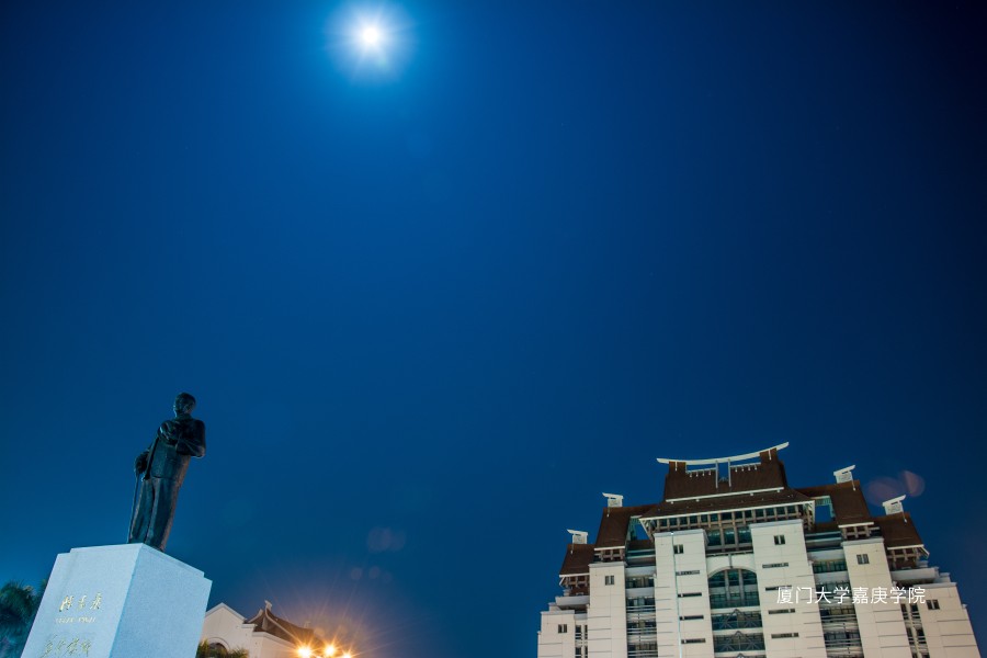 月色下,校主陈嘉庚先生的铜像守护的偌大的校园。