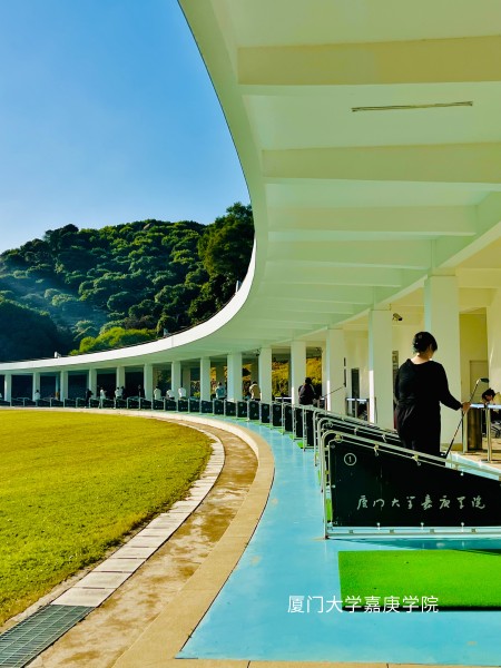 蓝道映青山,学子握杆远眺,嘉庚的运动活力与自然共融。