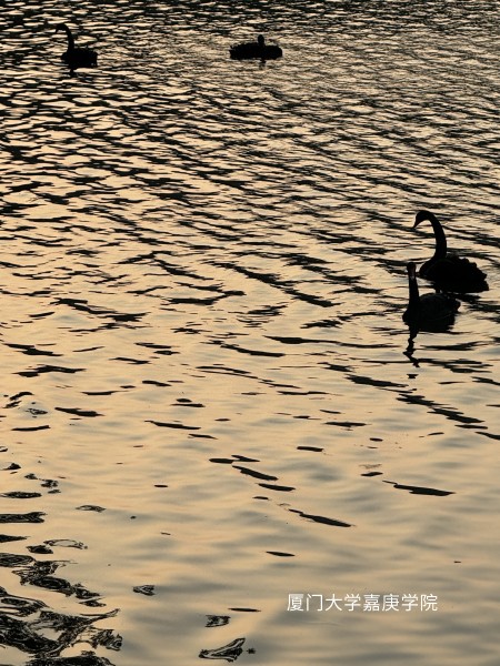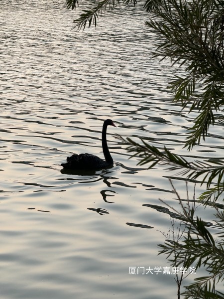 第一幅图,主体为一只在水面游动的黑天鹅。画面整体色调柔和,呈现出暖黄色调,水面泛起层层波纹。黑天鹅全身黑色羽毛,姿态优雅,位于画面中央偏左位置,它的倒影清晰地映在水面,增添了画面的对称美感。画面右上角和右下角有树枝枝叶,形成自然的框架构图,简洁的布局突出了黑天鹅的孤独与优雅。