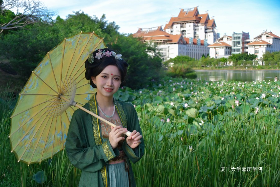 在这柔和的初夏之晨,厦门大学嘉庚学院的校园里,荷花悠然绽放,犹如一幅清新脱俗的水墨画卷,静谧地铺展在碧波荡漾的水面之上。与往昔的繁忙与喧嚣截然不同,今日的校园被一层古典而雅致的气息轻轻环绕,营造出一种超凡脱俗的氛围——一位身着宋制汉服的校友,步履轻盈,如同从古代走来的文人墨客,悠然穿梭于荷塘小径之间。她的身影与满池的荷花相映成趣,仿佛时光在这一刻凝固,让人恍若置身于一幅流动的画卷之中,共同演绎了一场跨越时空、美轮美奂的视觉盛宴。荷花的清雅与校友的汉服之美交相辉映,构成了一幅令人心旷神怡、难以忘怀的初夏景致。