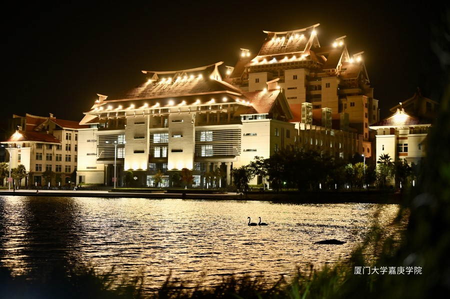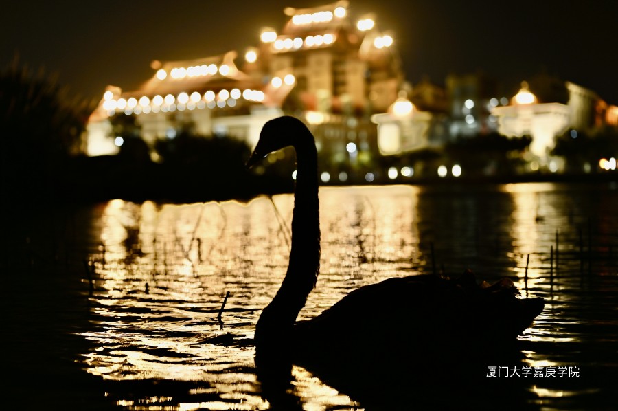 黑天鹅结伴欣赏着嘉庚学院主楼的璀璨辉煌(拍摄于湖心岛)