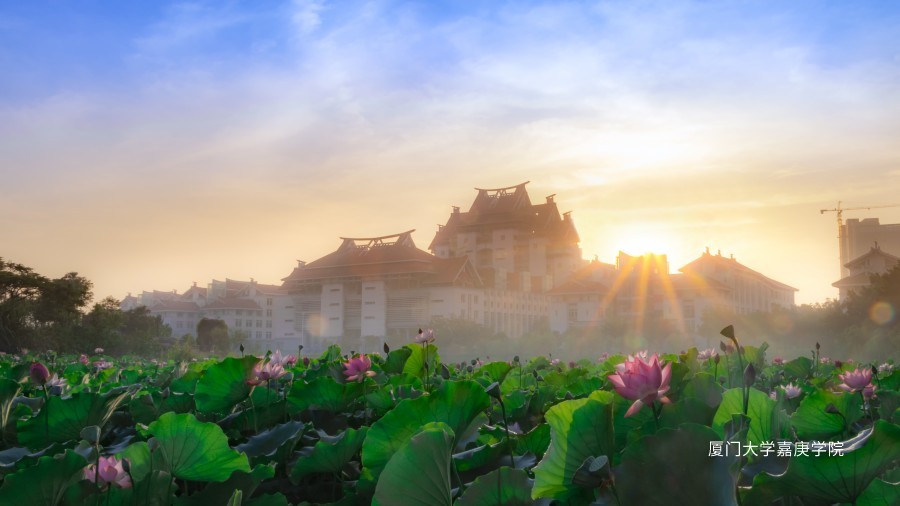 早晨太阳刚刚升起,阳光透过主楼群洒在荷花池。
