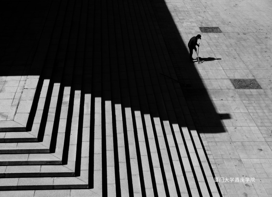 通过大面积的光比留白与人物形成点面对比关系,人是一“点”,画面大量光比可谓生活,则为一“滴”,渲染清洁工平凡的人生的点点滴滴。