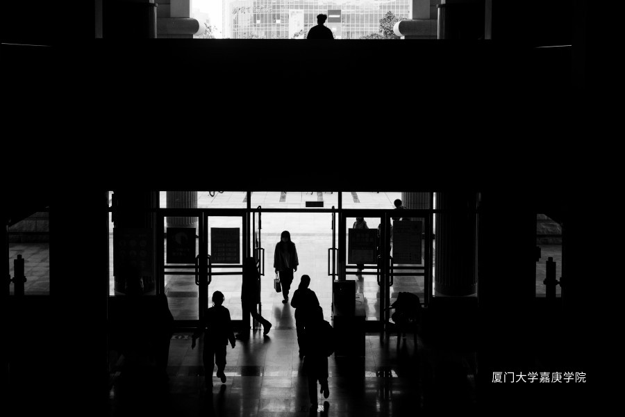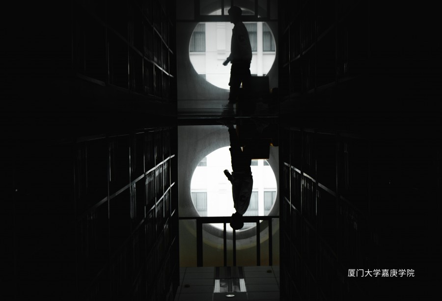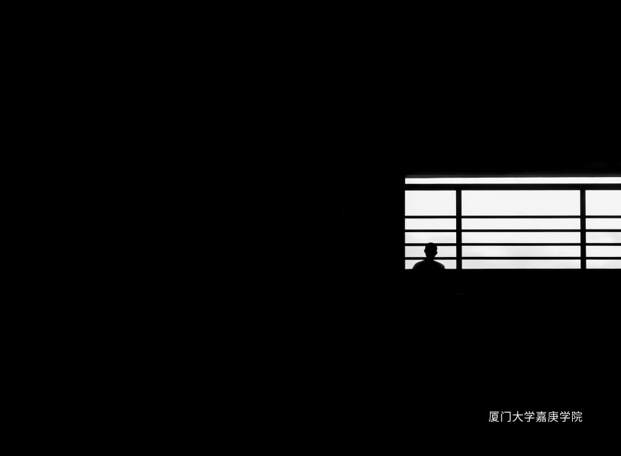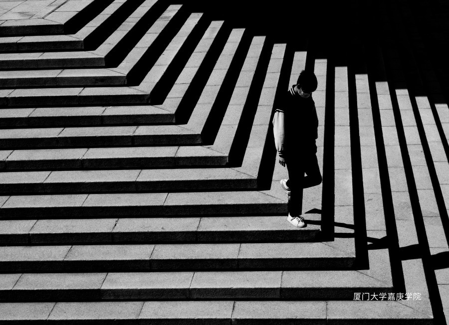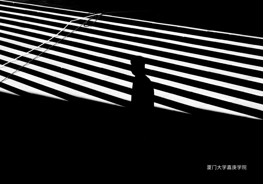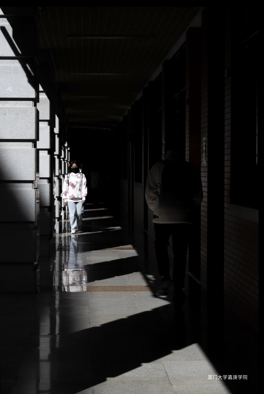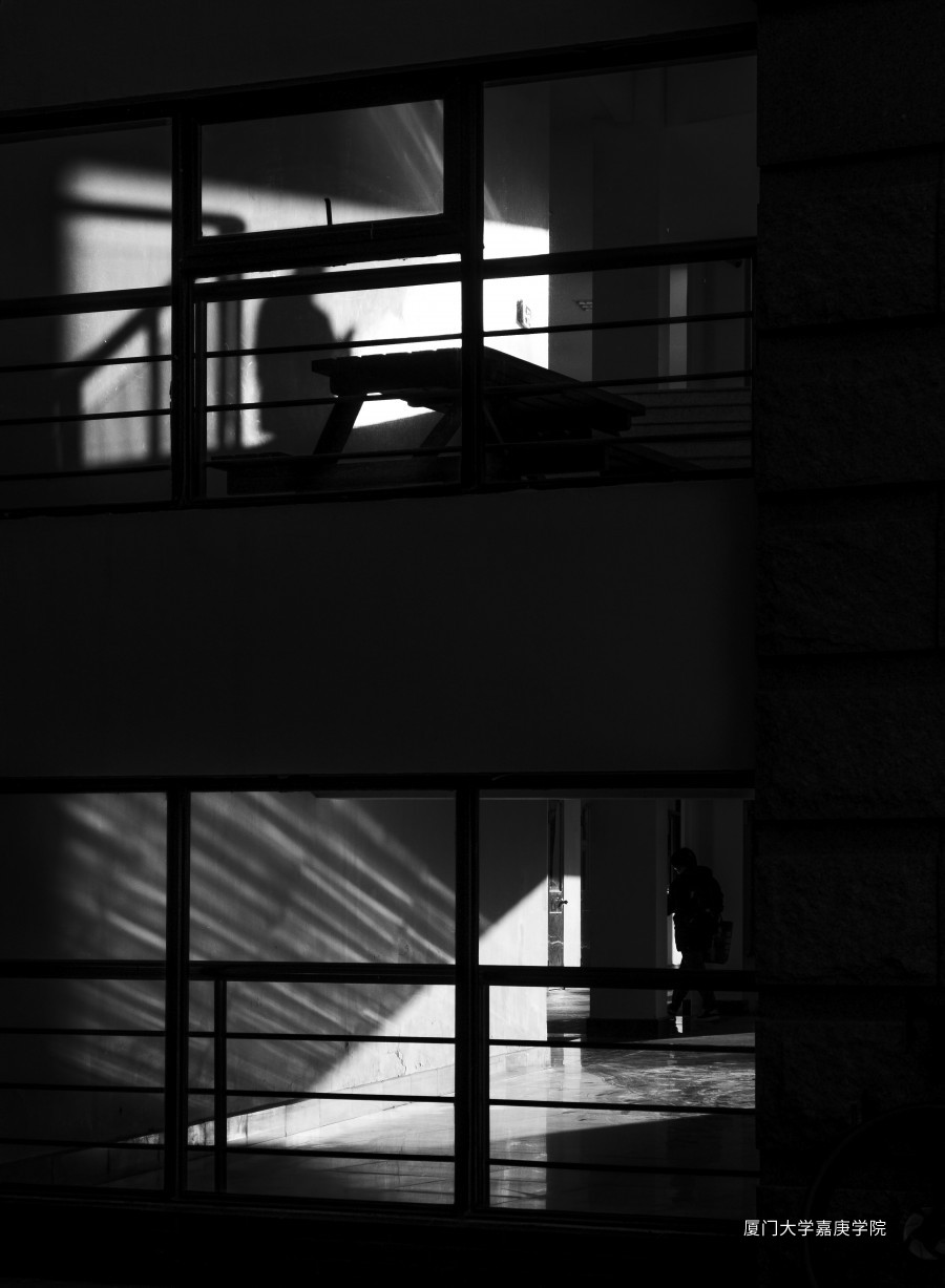 下午时刻,公共大楼的扶手栏杆在阳光的投射下形成剪影效果,此时正好有一位学生出现在光线明亮的区域,这幅“窗户”里的人物剪影给人们留下更多的想象空间。
