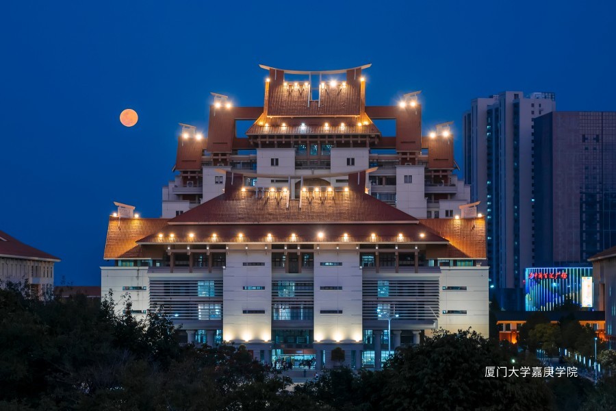 金黄的圆月伴随着渐浓的暮色与主楼同框出现