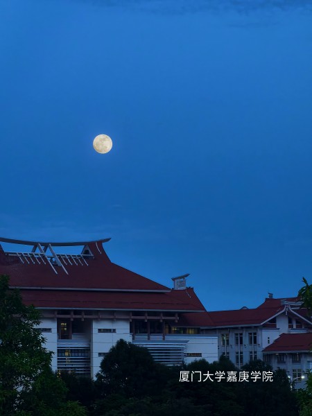 在这片湛蓝的天幕之上,一轮圆月宛如一颗璀璨的明珠,高悬于夜空。它散发着柔和而明亮的光芒,将整个校园笼罩在一片银白的光辉之中。
