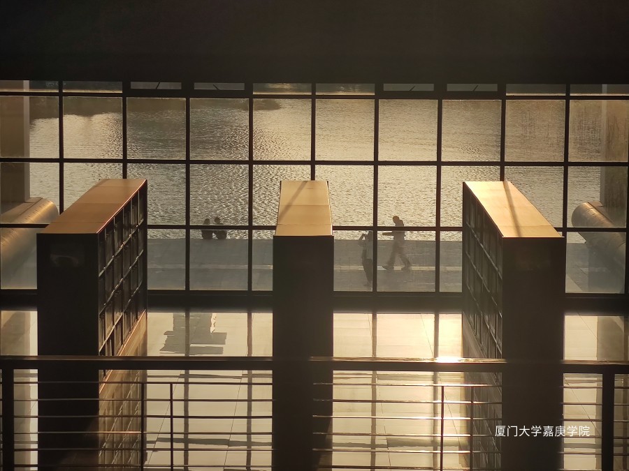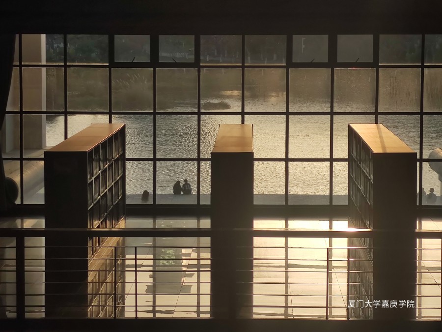 黄昏之下,透过图书馆的窗,一对情侣沿湖边相依而坐,犹如小说篇章中的画面。