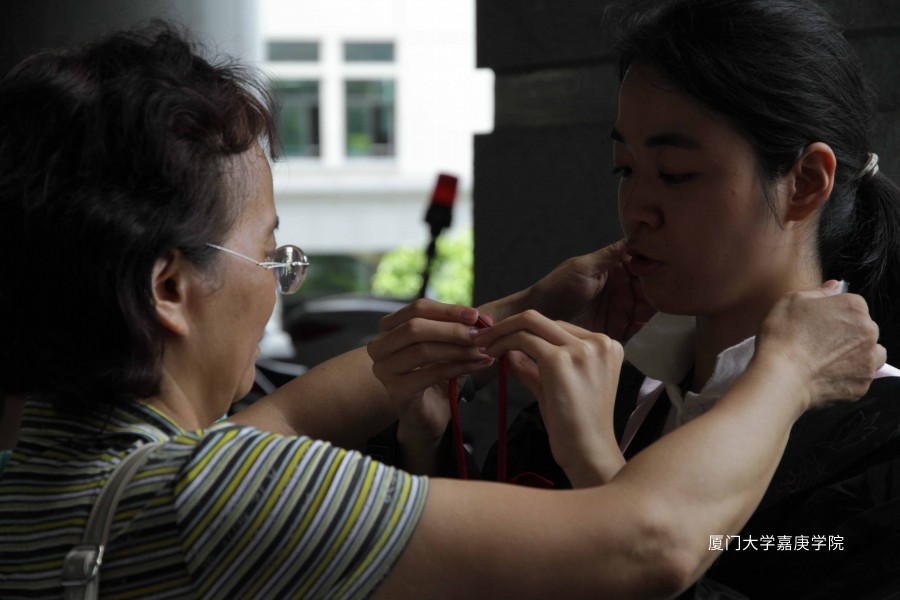 母亲为孩子整理学士服