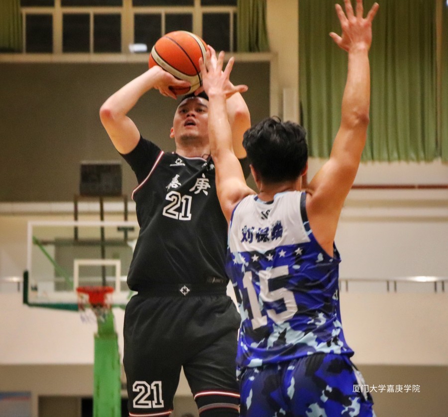 21号退役队员准备进行3分投篮,15号现役队员防守