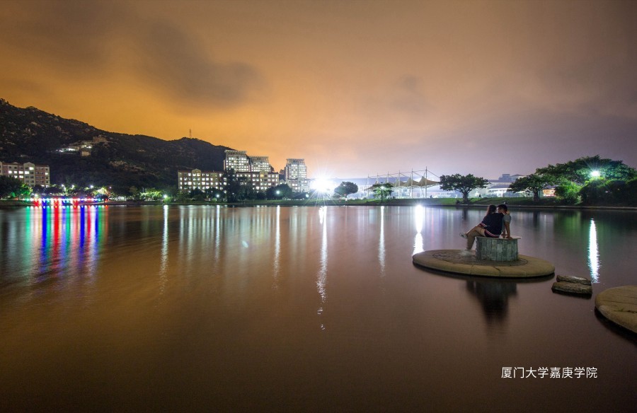 碧湖春晓,一对情侣,远处传来的是学活的琴声。